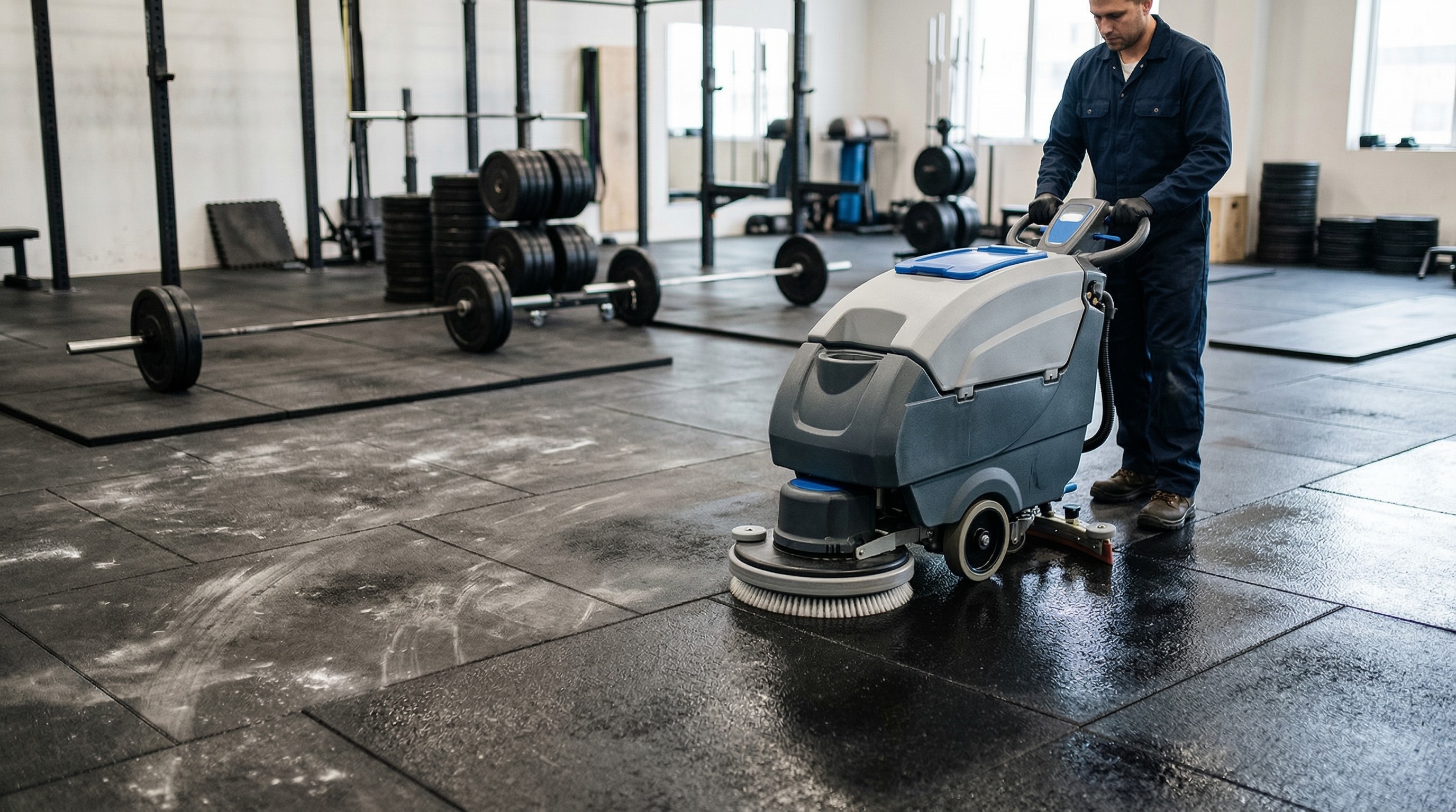 Many gyms attempt to handle all cleaning internally. While this works for basic maintenance, most facilities lack the equipment needed for deep rubber floor restoration.